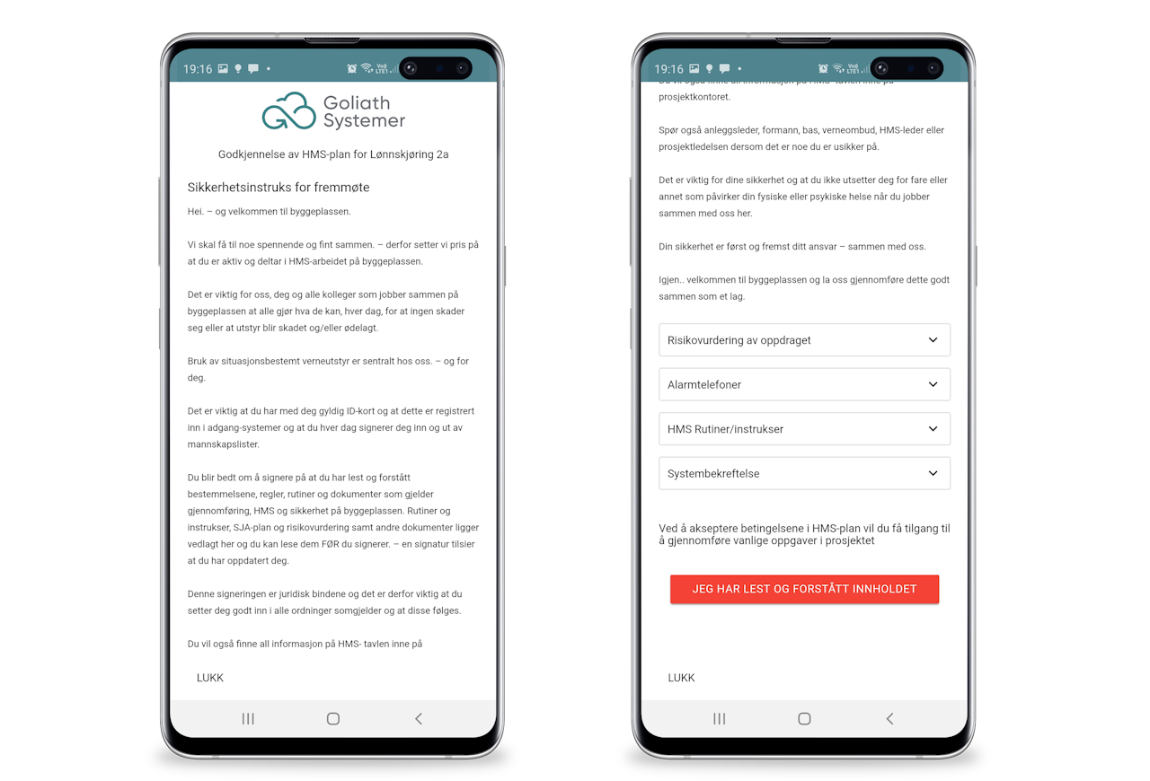 NB. Deltakere får først tilgang til prosjekt og prosjektets funksjoner ved og lese å bekrefte erklæringen som ligger under "meldinger" på mobilens forside. Varsel om at en erklæring venter godkjenning sendes på epost og sms til den ansatte.